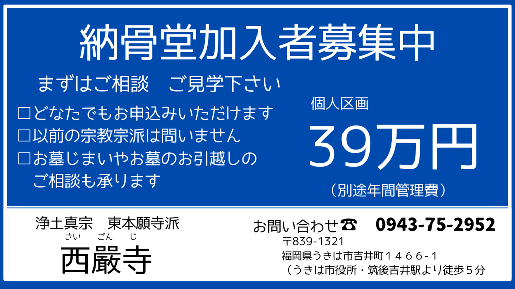 福岡県うきは市吉井町にある西嚴寺(さいごんじ)住職の浅野紀章です。当院では通夜葬儀をはじめ、年回忌法要や墓地建碑法要など各種ご法要を承っております。